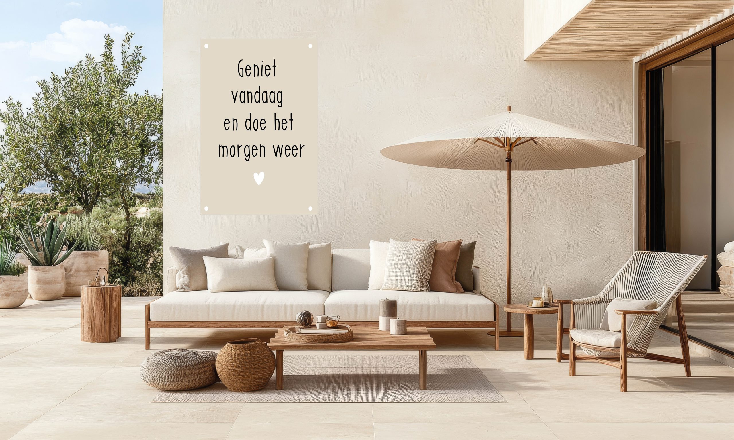 Wie wil deze leuk tuinposter nou niet in zijn tuin”. De poster is voorzien van 4 metalen ringen en gemakkelijk op te hangen. Het formaat van de tuinposter is gemaakt van PVC-doek, 510 gram