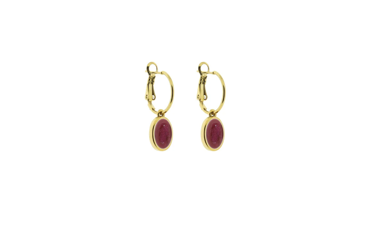 en oorhanger met daaraan een ovale setting met een ovale 8x10mm cabochon. De goudkleurige onderdelen zijn gemaakt van hoogwaardig, roestvrij staal. De oorbel is totaal 3cm lang.