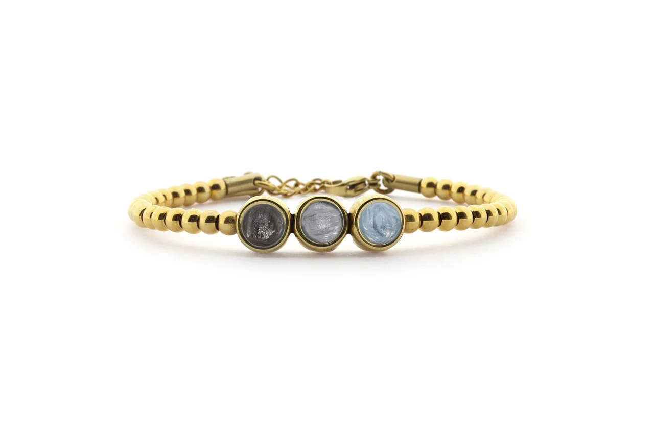 Armband gemaakt van 4mm ronde, goudkleurige, stainless steel kraaltjes op ketting geregen met 3 settings met 6mm cabochons. Door het karabijnslot en de verlengketting kun je de armband passend maken voor jouw pols! De lengte van de armband is ongeveer 17-21cm. Kies uit een van de 6 prachtige kleurseries!