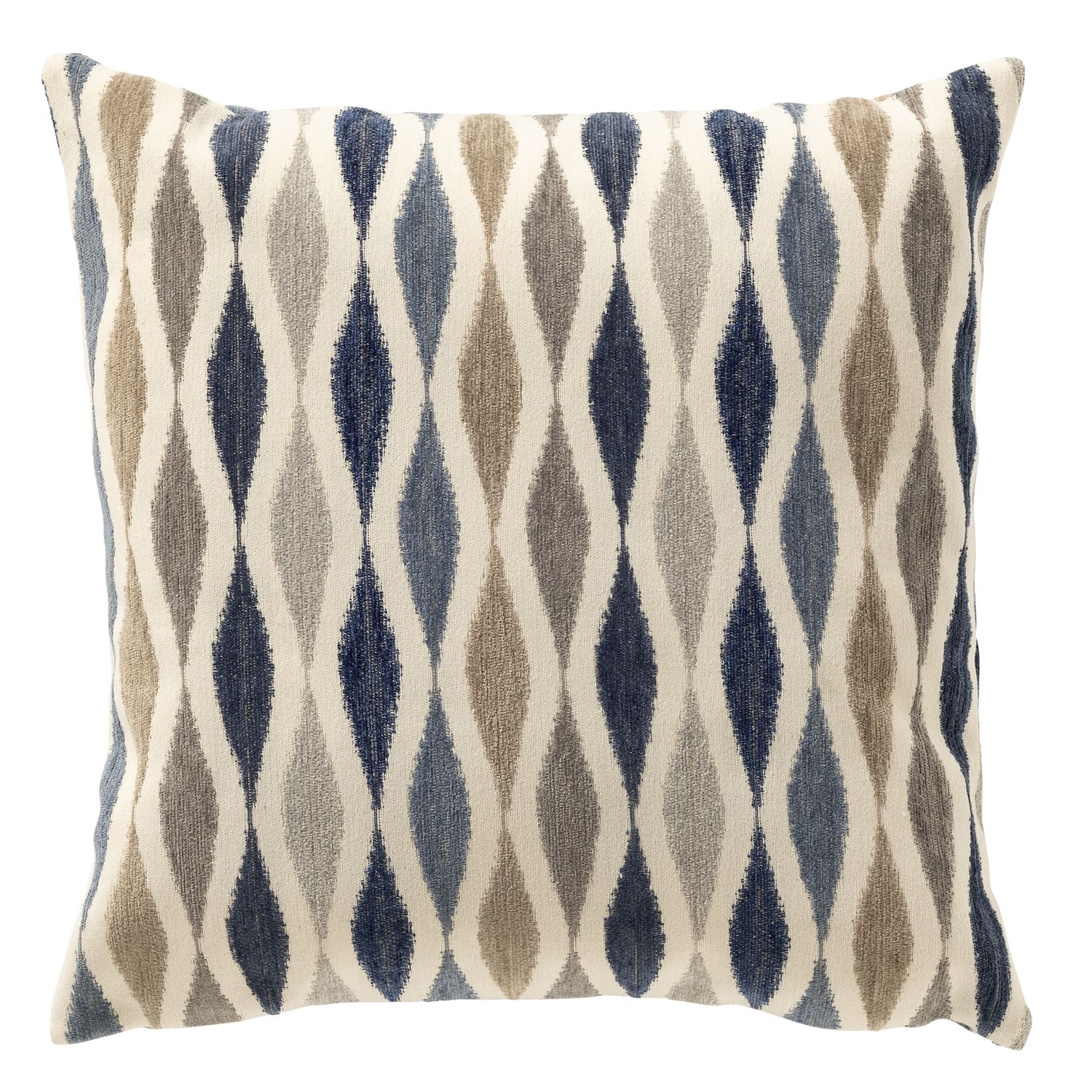 Sierkussen Tula heeft een golvend patroon in bijpassende kleuren wit, beige en blauw (Dark Denim).