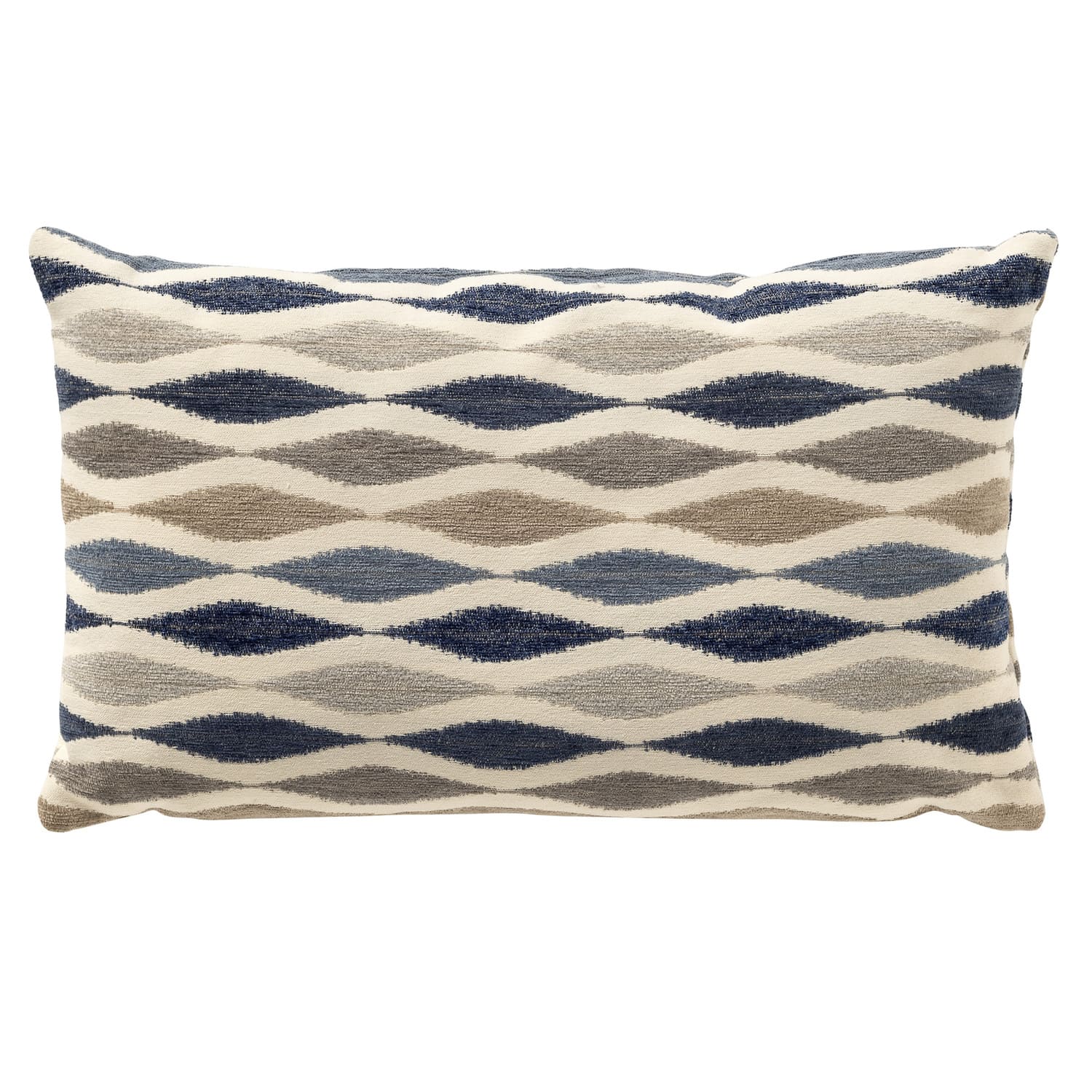 • Voor- en achterzijde met hetzelfde grafische, golvende patroon in blauw, beige en wit.